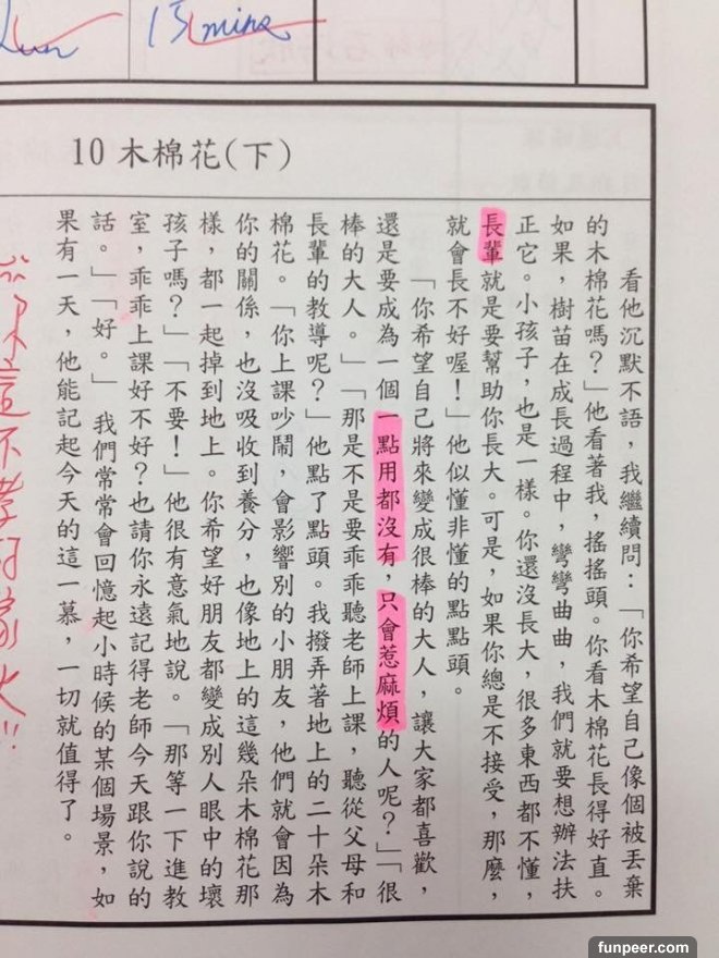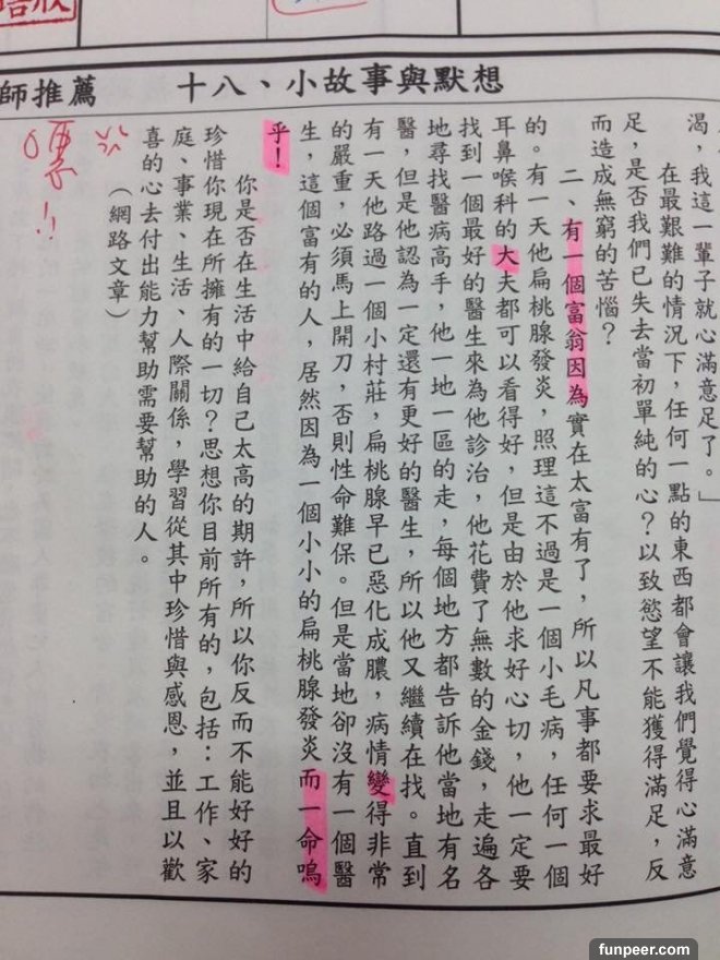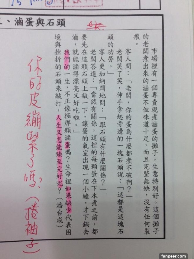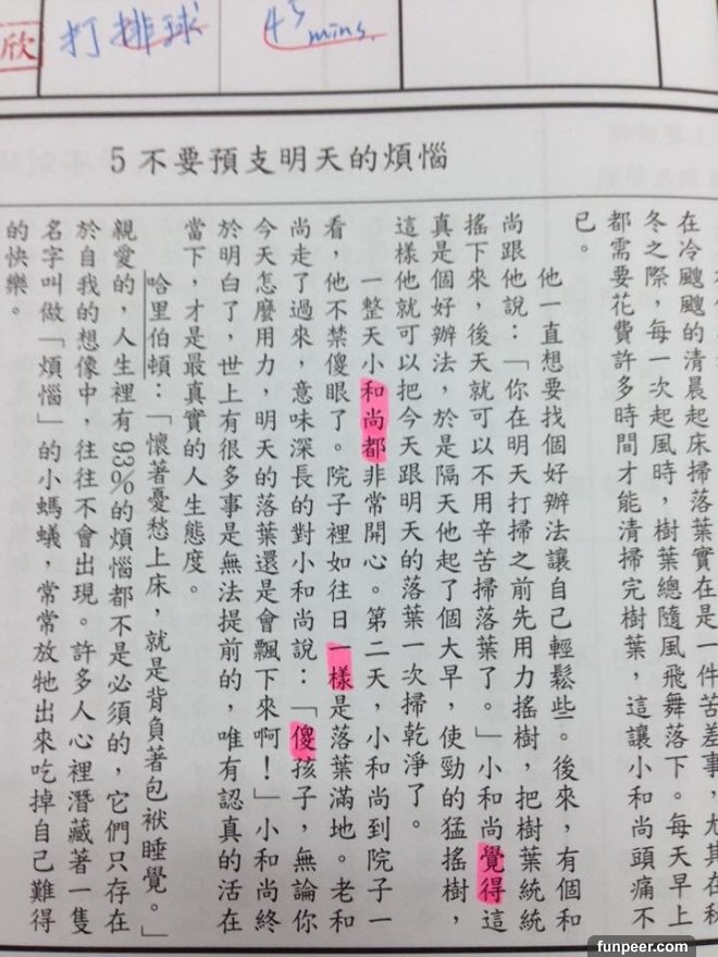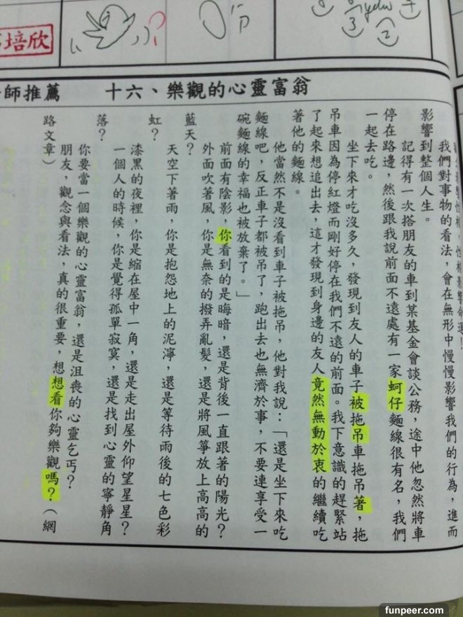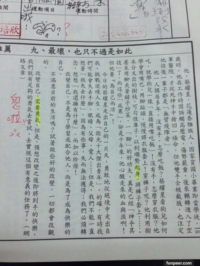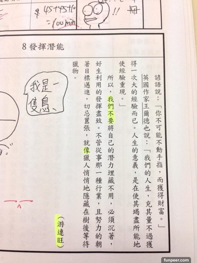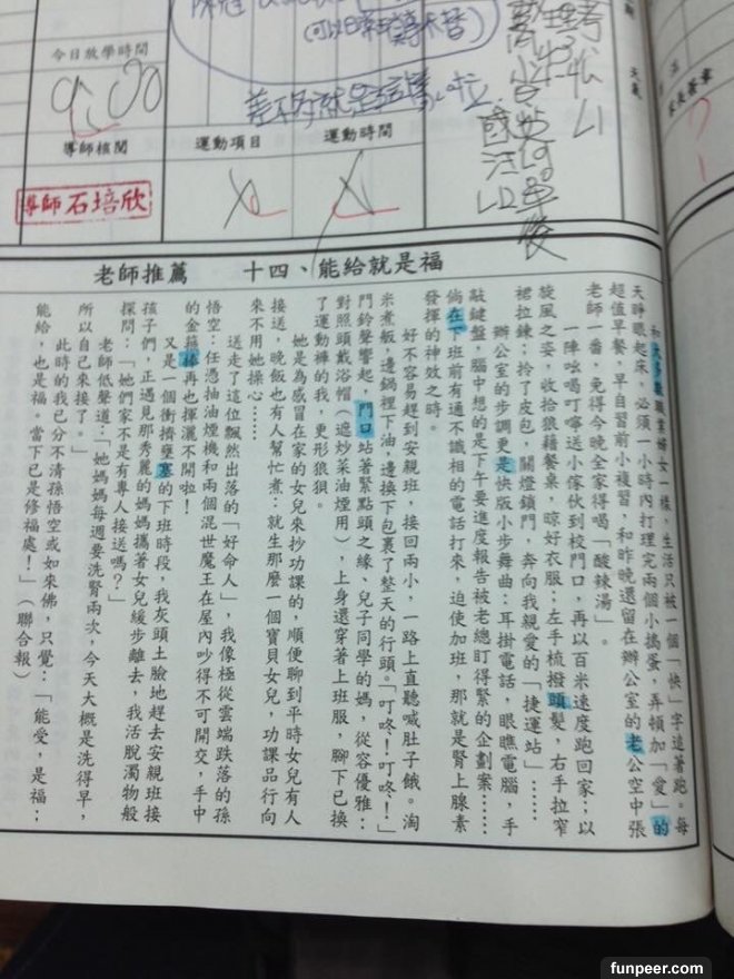 不過有位網友PO出在國中的時候,聯絡簿下方的勵志小文章,老師要求每天要畫上重點;國中每天應付一堆考試和書早就壓力大得跟什麼一樣了,怎可能還在那邊乖乖畫重點看這些...沒想到網友創意大開竟把文章的重點變成這樣....